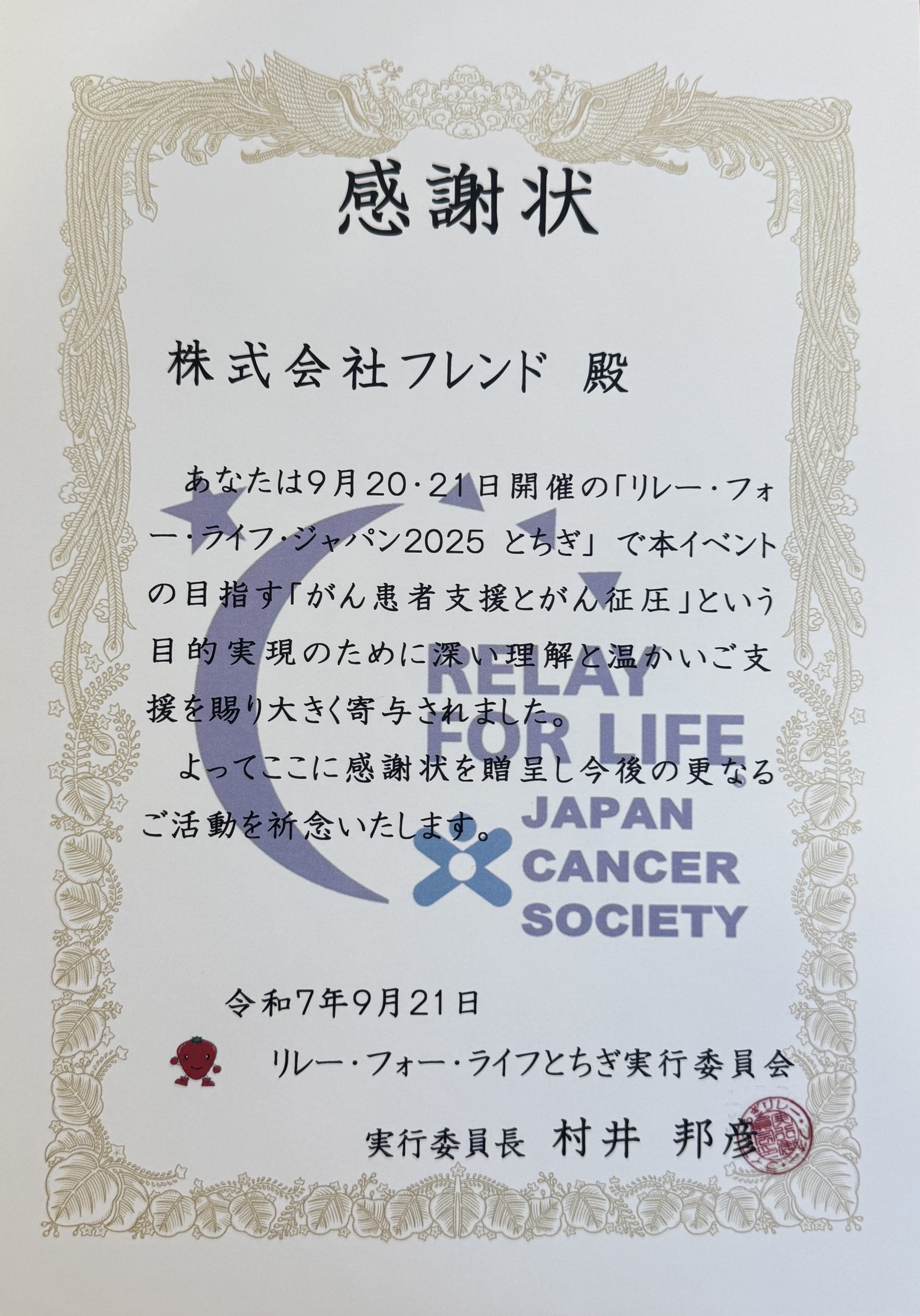 「リレー・フォー・ライフ・ジャパン 2025 とちぎ」に協賛し、感謝状を拝受いたしました