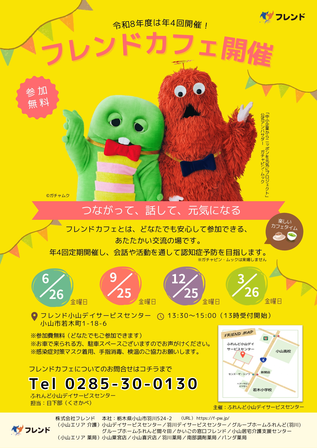 ふれんど小山デイサービスセンターでは、令和8年度「フレンドカフェ」を年4回開催いたします。
